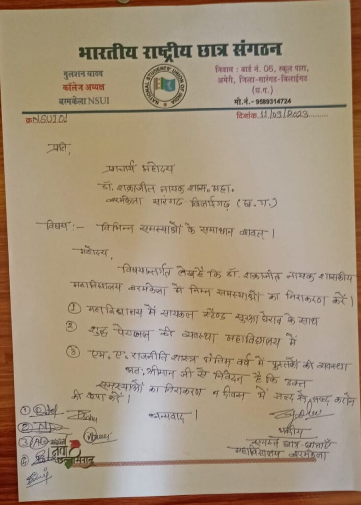 बरमकेला/आज NSUI टीम बरमकेला के द्वारा डॉ. शक्राजीत नायक शासकीय महाविद्यालय बरमकेला के प्राचार्य को महाविद्यालयीन छात्र/छात्राओं को महाविद्यालय में हो रही समस्याओं से अवगत कराकर उन समस्याओं को जल्द से जल्द निराकरण करने के लिए ज्ञापन दिये।