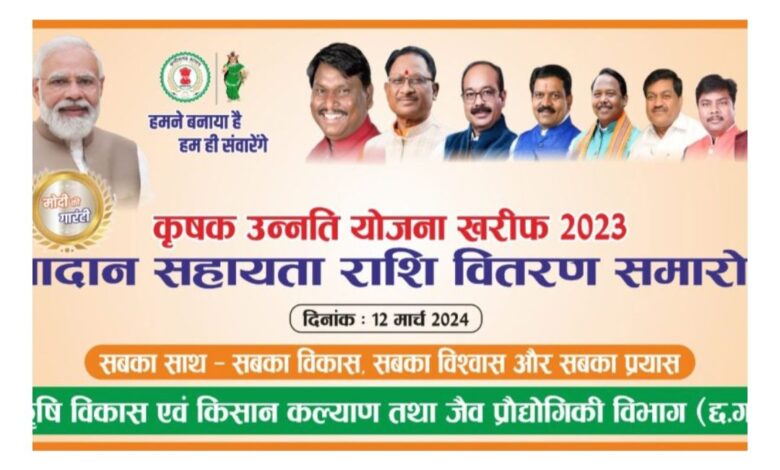 गौरतलब है कि प्रधानमंत्री श्री नरेन्द्र मोदी ने छत्तीसगढ़ के किसानों से 3100 रूपए क्विंटल की दर से धान खरीदी की गारंटी दी थी। इस गारंटी को पूरा करने के लिए छत्तीसगढ़ सरकार की कृषक उन्नति योजना का प्रदेशव्यापी शुरूआत 12 मार्च मंगलवार को होने जा रहा है। इस योजना के तहत किसानों को आदान सहायता राशि का अंतरण उनके बैंक खातों में करने के लिए राज्य के सभी जिला मुख्यालयों सहित विकासखण्ड मुख्यालयों में भी कार्यक्रम आयोजित होंगे।