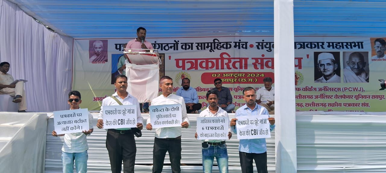 सुवर्ण कुमार भोई/रायपुर:- गांधी जयंती के अवसर पर रायपुर के गॉस मेमोरियल ग्राउंड में आयोजित “पत्रकार संकल्प महासभा” में प्रदेश के 35 से अधिक पत्रकार संगठनों की एकजुटता देखने को मिली। इस महासम्मेलन में हजारों पत्रकारों ने भाग लिया, जिसमें पत्रकार सुरक्षा कानून लागू करने और पत्रकारों के हितों की रक्षा करने जैसी प्रमुख मांगें उठाई गईं। पीड़ित पत्रकारों ने अपनी आपबीती साझा करते हुए, भ्रष्टाचार और माफियाओं के खिलाफ रिपोर्टिंग करने पर झूठे मामलों में फंसाए जाने और धमकियों का सामना करने का दर्द बयां किया।